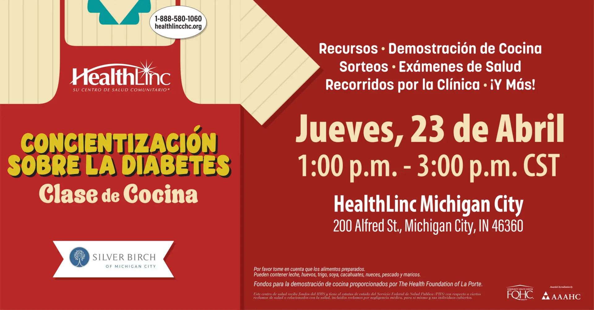 Join HealthLinc Michigan City’s Diabetes Awareness Cooking Class for Silver Birch Assisted Living! There will be resources, a cooking demo, giveaways, screenings, clinic tours and more. We can’t wait to cook with you! 🍳